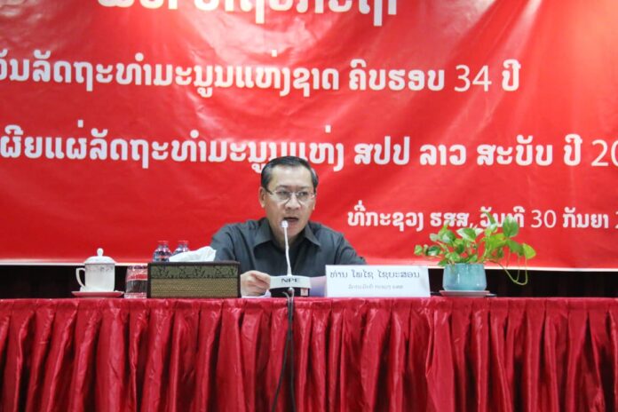 ກະຊວງແຮງງານ ແລະ ສະຫວັດດີການສັງຄົມ (ຮສສ) ໄດ້ຈັດພິທີປາຖະກະຖາ ວັນລັດຖະທໍາມະນູນແຫ່ງຊາດ ຄົບຮອບ 34 ປີ ແລະ ໂຄສະນາເຜີຍແຜ່ລັດຖະທໍາມະນູນແຫ່ງ ສປປ ລາວ ສະບັບ ປີ 2025 ຂຶ້ນໃນວັນທີ 30 ກັນຍານີ້ ທີ່ ກະຊວງດັ່ງກ່າວ ບ້ານ