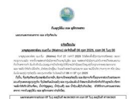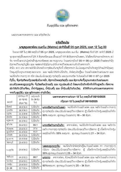 #ພາຍຸໝູນເຂດຮ້ອນແມດໂມ (Matmo) ປະຈໍາວັນທີ 05 ຕຸລາ 2025, ເວລາ 12:00 ໂມງ ໃນເວລາ 07:00 ໂມງ ຂອງວັນທີ 05 ຕຸລາ 2025, ພາຍຸໝູນເຂດຮ້ອນແມດໂມ (Matmo) ຫົວທີ 21 ປະຈໍາປີ 2025 ມີຈຸດສູນກາງຢູູ່ເສັັ້ນຂະໜານທີີ່ 21.1 ອົງສາເໜືອ ແລະ ເສັັ້ນແວງທີີ່ 111.8 ອົງສາຕາເວັນອອກ, ໄດ້ເຄືີ່ອນທີີ່ຜ່ານເກາະໄຫໜານ ສປ ຈີນ ຈາກນັັ້ນຄາດວ່າມຸ້ງໜ້າເຂົ້າສູ່ພາກເໜືອຂອງ ສສ ຫວຽດນາມ ໃນລະຫ່ວາງວັນທີ 05 ຫາ 06 ຕຸລາ 2025 ທີີ່ຈະອ່ອນກໍາລັງລົງກາຍເປັນພາຍຸດີເປຊັນ ແລະ ຈະອ່ອນກໍາລັງລົງຕາມລໍາດັບກາຍເປັນຍ່ອມຄວາມກົດດັນອາກາດຕໍ່າ.