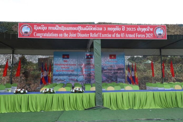 ວັນທີ 5 ຕຸລາ 2025 ນີ້, ຢູ່ ສະໜາມເຝິກຊ້ອມກອບກູໄພພິບັດອ່າງນໍ້າຫຸມ ແຕ່ລະພາກສ່ວນໄດ້ນຳເອົາອຸປະກອນ ແລະ ພາຫະນະຕ່າງໆ ເຂົ້າສູ່ພາກສະໜາມເພື່ອກຽມຄວາມພ້ອມໃຫ້ແກ່ພິທີເປີດການເຝິກຊ້ອມກອບກູ້ໄພພິບັດຮ່ວມ 3 ກອງທັບ ກຳປູເຈຍ-ລາວ-ຫວຽດນາມ.