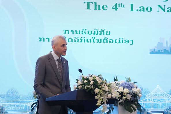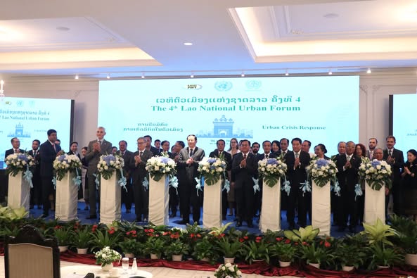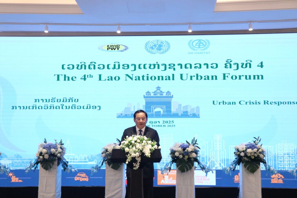 ກອງປະຊຸມເວທີຕົວເມືອງແຫ່ງຊາດຄັ້ງທີ 4 ຈັດຂຶ້ນໃນຕອນເຊົ້າວັນທີ 6 ຕຸລາ 2025 ທີ່ໂຮງແຮມສຸພັດຕຣາ ນະຄອນຫຼວງວຽງຈັນ ໂດຍການໃຫ້ກຽດເຂົ້າຮ່ວມຂອງທ່ານ ສອນໄຊ ສີພັນດອນ ນາຍົກລັດຖະມົນຕີ, ທ່ານ ເຫຼັກໄຫຼ ສີວິໄລ ລັດຖະມົນຕີກະຊວງໂຍທາທິການ ແລະ ຂົນສົ່ງ, ທ່ານ ບາໂຄເດຍ ເບີຄະນ໋ອບ ຜູ້ປະສານງານອົງການສະຫະປະຊາຊາດ ປະຈໍາລາວ, ຜູ້ຕາງໜ້າຈາກສະຖານທູດ, ອົງການຈັດຕັ້ງສາກົນປະຈໍາລາວ ພ້ອມດ້ວຍພາກສ່ວນກ່ຽວຂ້ອງ.