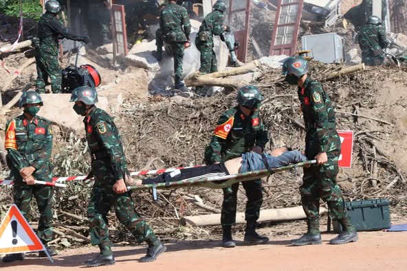 ກອງທັບກຳປູເຈຍ-ລາວ-ຫວຽດນາມຝຶກຊ້ອມກອບກູ້ໄພພິບັດຮ່ວມປະສານທຸກພາກສ່ວນເພື່ອໃຫ້ຂັ້ນເທິງສັງເກດການຄັ້ງທີ 2 ໃນວັນທີ 13 ຕຸລາ ຜ່ານມາ ທີ່ສະໜາມຝຶກຊ້ອມອ່າງນໍ້າຫຸມ ເມືອງນາຊາຍທອງ ນະຄອນຫຼວງວຽງຈັນ, ໂດຍມີທ່ານ ພົນຕີ ສາຍໃຈ ກົມມະສິດ ຮອງລັດຖະມົນຕີກະຊວງປ້ອງກັນປະເທດ, ຫົວໜ້າກົມໃຫຍ່ເສນາທິການກອງ ທັບປະຊາຊົນລາວ, ຫົວໜ້າຄະນະຊີ້ນໍາການຝຶກຊ້ອມກອບກູ້ໄພພິບັດຮ່ວມ 3 ກອງທັບປະຈໍາປີ 2025, ທ່ານ ພັນເອກ ຟ້າມ ວັນຢູ້ງ ຮອງຫົວໜ້າເສນາທິການທະຫານເຂດ 4, ຫົວໜ້າຄະນະຊີ້ນໍາກອບກູ້ໄພພິບັດຮ່ວມ 3 ກອງທັບຝ່າຍຫວຽດນາມ, ທ່ານ ພັນເອກ ລົງ ກິມທຽນ ຮອງຫົວໜ້າກົມອົບຮົມ ກອງບັນຊາການທະຫານສູງສຸດ, ຫົວໜ້າຄະນະຊີ້ນໍາຝຶກຊ້ອມກອບກູ້ໄພພິບັດຮ່ວມ 3 ກອງທັບຝ່າຍກໍາປູເຈຍ ພ້ອມດ້ວຍພາກສ່ວນກ່ຽວຂ້ອງ 3 ກອງທັບເຂົ້າຮ່ວມ.