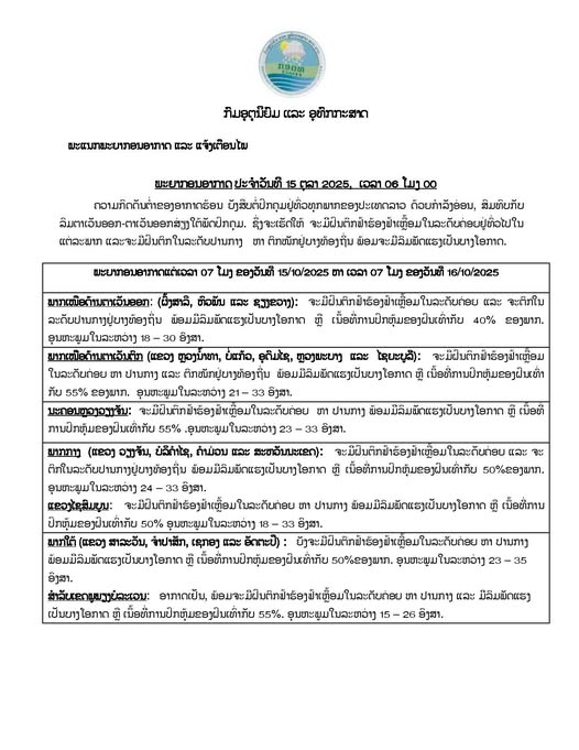 ພະຍາກອນອາກາດ ປະຈຳວັນທີ 15 ຕຸລາ 2025