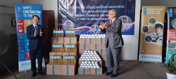 ເມື່ອບໍ່ດົນມານີ້, ລັດຖະບານຣັດເຊຍ ຮ່ວມກັບ ອົງການອາຫານໂລກ (WFP) ໄດ້ນຳເອົານໍ້າມັນກາດອກຕາເວັນ ຈໍານວນ 23 ໂຕນ ແລະ ປ໋ອງປາ 99 ໂຕນ ມາມອບໃຫ້ລັດຖະບານລາວ ກໍຄື ກະຊວງສຶກສາທິການ ແລະ ກິລາ ເພື່ອປະກອບສ່ວນສະໜັບສະໜູນໂຄງການອາຫານທ່ຽງໃນໂຮງຮຽນ ຢູ່ ສປປ ລາວ ກໍຄື ສະໜອງອາຫານທີ່ມີຄຸນຄ່າທາງໂພຊະນາການ ໃຫ້ແກ່ນັກຮຽນຊັ້ນປະຖົມເຂດທີ່ຂາດແຄນອາຫານໃນທົ່ວປະເທດ, ຕາງໜ້າມອບໂດຍ ທ່ານ ວາລາດີເມຍ ກາລີນິນ ເອກອັກຄະລັດຖະທູດ ວິສາມັນຜູ້ມີອໍານາດເຕັມ ແຫ່ງ ສ ຣັດເຊຍ ປະຈໍາ ລາວ, ທ່ານ ມາກ ອັນເດຣ ຜູ້ຕາງໜ້າອົງການຫານໂລກ ປະຈໍາ ລາວ ແລະ ຮັບໂດຍ ທ່ານ ທອງສະລິດ ມັງໜໍ່ເມກ ລັດຖະມົນຕີກະຊວງສຶກສາທິການ ແລະ ກິລາ ໂດຍມີພາກສ່ວນກ່ຽວຂ້ອງ ສອງຝ່າຍ ເຂົ້າຮ່ວມ.