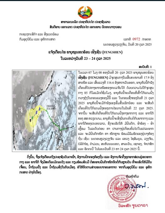 ແຈ້ງການສໍາຄັນ ແຈ້ງເຕືອນ! ກຽມຮັບມືກັບພາຍຸໝູນເຂດຮ້ອນ ເຟີງເຊິນ (FENGSHEN) ໃນໄລຍະວັນທີ 23-24 ຕຸລານີ້ By phetchinda - 20/10/2025 0 FacebookTwitterPinterestWhatsApp ແຈ້ງເຕືອນ! ກຽມຮັບມືກັບພາຍຸໝູນເຂດຮ້ອນ ເຟີງເຊິນ (FENGSHEN) ໃນໄລຍະວັນທີ 23-24 ຕຸລານີ້ ຊຶ່ງຈະເຮັດໃຫ້ຝົນຕົກໜັກ ຫາ ໜັກຫຼາຍ ຢູ່ພາກກາງ ຫາ ພາກໃຕ້ ເຊັ່ນ: ນະຄອນຫຼວງວຽງຈັນ, ໄຊສົມບູນ, ແຂວງວຽງຈັນ, ບໍລິຄຳໄຊ, ຄຳມ່ນ, ສະຫວັນນະເຂດ, ສາລະວັນ, ເຊກອງ, ຈຳປາສັກ ແລະ ອັດຕະປື