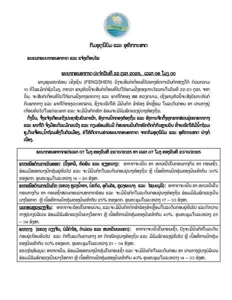 ພະຍາກອນອາກາດ ປະຈຳວັນທີ 22 ຕຸລາ 2025