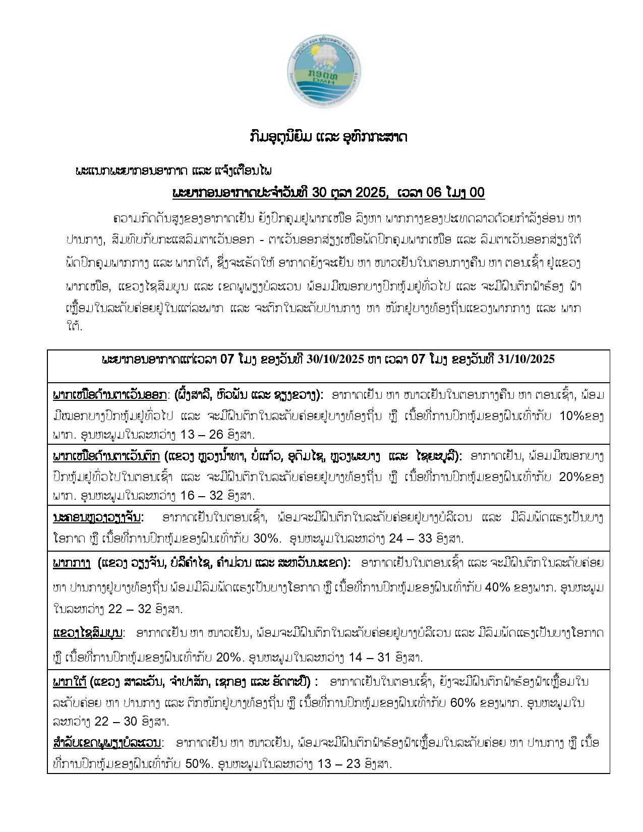 ພະຍາກອນອາກາດ ປະຈໍາເຊົ້າວັນທີ 30 ຕຸລາ 2025
