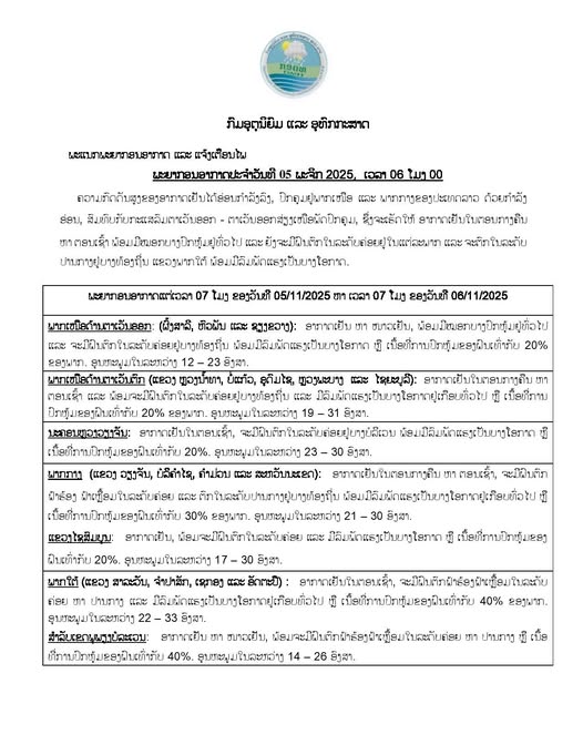ພະຍາກອນອາກາດ ແຕ່ເວລາ 07 ໂມງ ຂອງວັນທີ 05/11/2025 ຫາ ເວລາ 07 ໂມງ ຂອງວັນທີ 06/11/2025