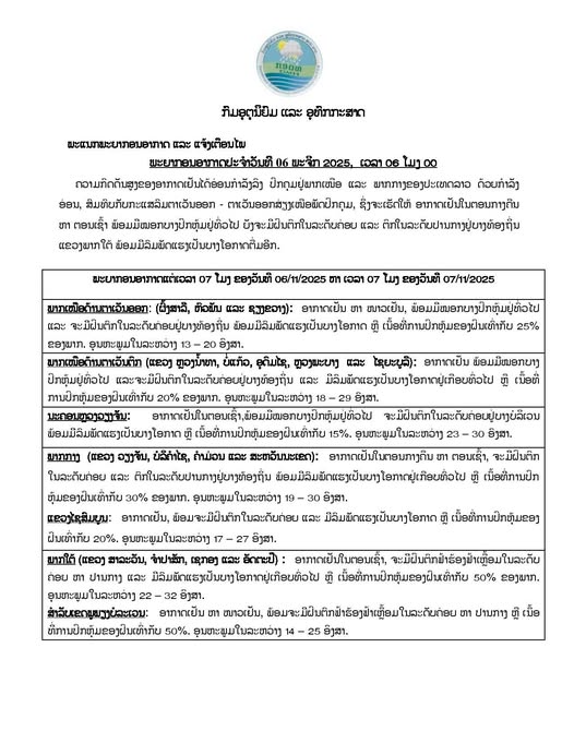 ພະຍາກອນອາກາດ ແຕ່ເວລາ 07 ໂມງ ຂອງວັນທີ 06/11/2025 ຫາ ເວລາ 07 ໂມງ ຂອງວັນທີ 07/11/2025