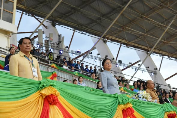 ໃນຕອນແລງຂອງວັນທີ 13 ພະຈິກ 2025 ທີ່ສະໜາມກິລາແຫ່ງຊາດ ຫລັກ 16, ໄດ້ມີການສະແດງທົດລອງຊ້ອມໃຫຍ່ເປັນ ຄັ້ງທີ 3 ແລະ ເປັນຄັ້ງສຸດທ້າຍ ກ່ອນພິທີທາງການຈະເປີດຂຶ້ນໃນວັນທີ 15 ພະ ຈິກ 2025, ໂດຍມີ ທ່ານ ນາງ ປານີ ຢາທໍ່ຕູ້ ຮອງປະທານປະເທດ, ທ່ານ ອາດສະພັງທອງ ສີພັນດອນ ເຈົ້າຄອງນະຄອນຫລວງວຽງຈັນ ປະທານຄະນະກໍາມະການຈັດງານມະຫະກຳກິລາແຫ່ງ ຊາດ ຄັ້ງທີ XII, ທ່ານ ກິ່ງມະໂນ ພົມມະຫາໄຊ ຮອງລັດຖະມົນຕີກະຊວງສຶກສາທິການ ແລະ ກິລາ, ມີຄະນະຮັບຜິດຊອບ, ຄູຝຶກ, ອະນຸກຳມະການແຕ່ລະພາກສ່ວນ ພ້ອມດ້ວຍກ້ອນກຳລັງຕ່າງໆ ແລະ ສື່ມວນຊົນ ເຂົ້າຮ່ວມ.