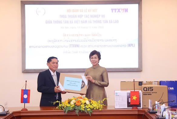 ໃນໂອກາດ ເດີນທາງຢ້ຽມຢາມ ແລະ ເຮັດວຽກ ຢູ່ ສສ ຫວຽດນາມ ໃນລະຫວ່າງ ວັນທີ 9-14ພະຈິກ 2025 ນີ້, ສະຫາຍ ວັນນະສິນ ສິມມະວົງ ຜູ້ອຳນວຍການໃຫຍ່ ສຳນັກຂ່າວສານປະເທດລາວ (ຂປລ-KPL) ພ້ອມຄະນະ ໄດ້ພົບປະສອງຝ່າຍ ກັບສະຫາຍ ນາງ ຫວູ ຫວຽດ ຈາງ ຜູ້ອໍາ ນວຍການໃຫຍ່ ສຳນັກຂ່າວສານຫວຽດນາມ (VNA-TTXVN) ພ້ອມຄະນະ ໃນ ຕອນເຊົ້າວັນທີ 13 ພະຈິກ 2025 ທີ່ນະຄອນຫລວງຮ່າໂນ້ຍ ເພື່ອສືບຕໍ່ເສີມຂະຫຍາຍ ແລະ ຮັດແໜ້ນສາຍພົວພັນມິດຕະພາບ, ຄວາມສາມັກຄີພິເສດ ແລະ ການຮ່ວມມືຮອບດ້ານ ລະຫວ່າງສອງພັກ, ສອງລັດ ເວົ້າລວມ, ເວົ້າສະເພາະ ສອງສໍານັກຂ່າວສານລາວ-ຫວຽດນາມ ທີ່ີມີມູນເຊື້ອໃຫ້ນັບມື້ເຂົ້າສູ່ລວງເລິກ ແລະ ແຕກດອກອອກຜົນຍິ່ງໆຂຶ້ນ.