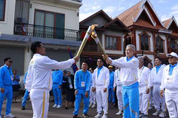 ຫລັງຈາກນັ້ນ ກໍໄດ້ມີການແລ່ນທວນໄຟສັກສິດ ຊຶ່ງເລີ່ມຈາກທ່ານ ທອງສະລິດ ມັງໜໍ່ເມກ ນໍາພາຂະບວນແຫ່-ແລ່ນທວນໄຟ ໂດຍເລີ່ມຈາກຈຸດທີ 1 ແລ້ວມອບທວນໄຟໃຫ້ ທ່ານ ອານຸພາບ ຕຸນາລົມ ນໍາພາຂະບວນສືບຕໍ່ ຈາກຈຸດທີ 2 ແລະ ມອບຕໍ່ໃຫ້ ທ່ານ ອາລຸນໄຊ ສູນນະລາດ ເລຂາຄະນະບໍລິຫານງານພັກແຂວງຈໍາປາສັກ ນໍາພາຂະບວນສືບຕໍ່ ຈາກຈຸດທີ 3 ແລະ ມອບທວນໄຟໃຫ້ຂະບວນນັກກິລາ ສືບຕໍ່ແລ່ນຕາມເສັ້ນທາງທີ່ໄດ້ກຳນົດໄວ້ຕາມເສັ້ນທາງຖະໜົນກຳແພງເມືອງ-ຖະໜົນ 13 ໃຕ້ ເຂົ້າສູ່ສະໜາມກິລາແຫ່ງຊາດ ຫລັກ 16 ແລ້ວສົ່ງມອບທວນໄຟໃຫ້ທ່ານຮອງເຈົ້າຄອງນະຄອນຫລວງວຽງຈັນ ເພື່ອນໍາທວນໄຟໄປໄວ້ຫ້ອງເກັບຮັກສາ (ສະໜາມກິລາແຫ່ງຊາດ ຫລັກ 16).