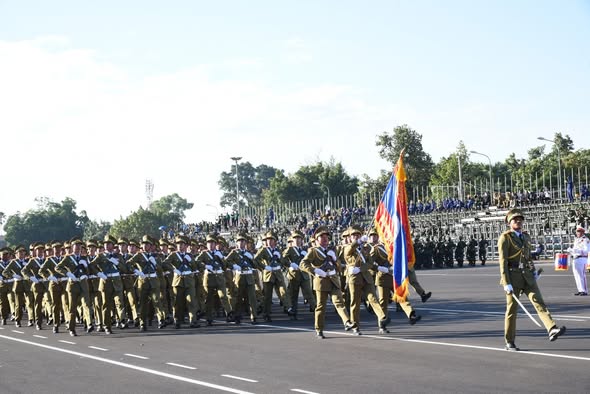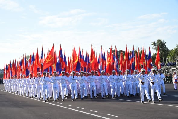 ກ້ອນເດີນສວນສະໜາມກຳລັງກະຊວງ ປກສ ປະກອບສ່ວນເຂົ້າຮ່ວມພິທີສະເຫຼີມສະຫຼອງວັນຊາດ ຄົບຮອບ 50 ປີ ມີທັງໝົດ 6 ກ້ອນກໍາລັງ ຄື:ກ້ອນທຸງຊາດ-ທຸງພັກ,ກ້ອນ ທຸງໄຊ ປກສ, ກ້ອນກຳລັງຕຳຫຼວດ, ກ້ອນກຳລັງປ້ອງກັນເຄື່ອນທີ່, ກ້ອນກຳລັງປ້ອງກັນສູນກາງ ແລະ ກ້ອນກໍາລັງຕໍາຫຼວດຈະລາຈອນຍິງ ລວມກຳລັງພົນ ທັງໝົດ 926 ສະ ຫາຍ ຍິງ 145 ສະຫາຍ ແລະ ກ້ອນຢືນກຳລັງ ປກສ ເຊິ່ງເປັນກຳລັງທີ່ມາຈາກກົມກອງອ້ອມຂ້າງ ທັງໝົດ 400 ສະ ຫາຍ ຍິງ 200 ສະຫາຍ.
