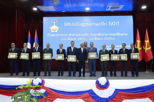 ຄະນະໂຄສະນາອົບຮົມສູນກາງພັກ (ຄອສພ) ຈັດພິທີປະດັບຫລຽນກາລະນຶກ 50 ປີ ວັນສະຖາປະນາ ສາທາລະນະລັດ ປະຊາທິປະໄຕ ປະຊາຊົນລາວ ໃນວັນທີ 28 ພະຈິກ 2025 ທີ່ຄະນະໂຄສະນາອົບຮົມສູນກາງພັກ ໂດຍໃຫ້ກຽດປະດັບຫລຽນກາລະນຶກໃນຄັ້ງນີ້ມີ ສະຫາຍ ຄໍາພັນ ເຜີຍຍະວົງ ຄະນະເລຂາທິການສູນກາງພັກ, ຫົວໜ້າ ຄອສພ, ປະທານສະພາທິດສະດີສູນກາງພັກ, ສະຫາຍ ລາວປາວຊົ່ງ ນະວົງໄຊ ກໍາມະການສູນກາງພັກ, ຮອງຫົວໜ້າ ຄອສພ, ສະຫາຍ ນາງ ວິລະວອນ ພັນທະວົງ ກໍາມະການປະຈໍາພັກ, ຮອງຫົວໜ້າ ຄອສພ, ພ້ອມດ້ວຍຮອງ ຄອສພ, ອະດີດພະນັກງານບໍານານ ຄອສພ ແລະ ພະນັກງານ-ລັດຖະກອນ ອ້ອມຂ້າງ ຄອສພ ເຂົ້າຮ່ວມ.