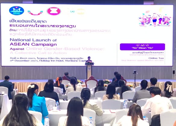 ກອງປະຊຸມເຜີຍແຜ່ລະດັບຊາດ ຂະບວນການໂຄສະນາຂອງອາຊຽນ ເພື່ອຕ້ານການໃຊ້ຄວາມຮຸ່ນແຮງທາງເພດ ຜ່ານທາງອອນລາຍ ພາຍໃຕ້ຫົວຂໍ້ “ຮ່ວມແຮງຮ່ວມໃຈກັນເພື່ອຢຸດຄວາມຮຸນແຮງຕໍ່ແມ່ຍິງ ແລະ ເດັກຍິງທຸກຄົນຜ່ານທາງດິຈິຕອນ” ຈັດຂຶ້ນໃນວັນທີ 8 ທັນວາ 2025 ຢູ່ນະຄອນ ຫລວງວຽງຈັນ ໂດຍການເປັນປະທານຮ່ວມຂອງ ທ່ານ ນາງ ພັນຈິນດາ ເລັ່ງສະຫວັດ ຮອງປະທານ ຄະນະບໍລິຫານງານສູນກາງສະຫະພັນແມ່ຍິງລາວ (ສສຍລ), ຮອງປະທານຄະນະກໍາມາທິການແຫ່ງຊາດເພື່ອຄວາມກ້າວໜ້າຂອງແມ່ຍິງ, ແມ່ ແລະ ເດັກ(ຄຊກມດ), ທ່ານ ແກ້ວວິສຸກ ໂສລະພົມ ຮອງລັດຖະມົນຕີກະຊວງເຕັກໂນໂລຊີ ແລະ ການສື່ສານ, ທ່ານ ບັກຕີຍໍ ກາດິຣບ ຜູ້ຕາງໜ້າອົງການສະຫະປະຊາຊາດ ກອງທຶນສໍາລັບປະຊາກອນ(UNFPA) ປະຈໍາລາວ, ມີບັນດາຜູ້ຕາງໜ້າຈາກກະຊວງ, ອົງ ການ, ຄູ່ຮ່ວມພັດທະນາ, ອົງການຈັດຕັ້ງສາກົນ ແລະ ພາກສ່ວນກ່ຽວຂ້ອງເຂົ້າຮ່ວມ ທັງແບບເຊິ່ງໜ້າ ແລະ ອອນລາຍ.