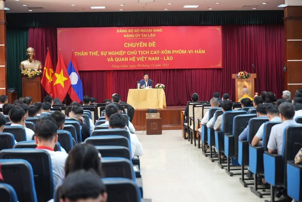 ສະຖານເອກອັກຄະລັດຖະທູດ ສສ ຫວຽດນາມ ປະຈໍາລາວ ຈັດພິທີປາຖະກະຖາ ຫວນຄືນມູນເຊື້ອວັນເກີດ ປະທານ ໄກສອນພົມວິຫານ ຄົບຮອບ 105 ປີ ແລະ ວັນສະຖາປະນາ ສປປ ລາວ ຄົບຮອບ 50 ປີ ໃນວັນທີ 9 ທັນວາ 2025 ໂດຍການປາຖະກະຖາໂດຍ ສະຫາຍ ສົມສະ ຫວາດ ເລັ່ງສະຫວັດ ອະດີດກຳມະການກົມການເມືອງສູນກາງພັກ, ອະດີດຮອງນາຍົກລັດຖະມົນຕີ, ມີສະຫາຍ ຫງວຽນ ມິງ ເຕີມ ເອກອັກຄະລັດຖະທູດ ວິສາມັນຜູ້ມີອໍານາດເຕັມແຫ່ງ ສສ ຫວຽດນາມ ປະຈໍາລາວ, ຜູ້ຕາງໜ້າຈາກອົງການ, ວົງຄະນະຍາດຫວຽດນາມອາໄສຢູ່ລາວ, ພະນັກງານ, ສະມາຊິກພັກ ສະຖານທູດຫວຽດນາມ ປະຈໍາລາວ ເຂົ້າຮ່ວມຮັບຟັງ.