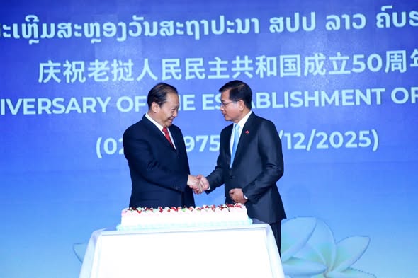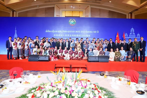 ສະຖານທູດແຫ່ງ ສາທາລະນະລັດ ປະຊາທິປະໄຕ ປະຊາຊົນລາວ ປະຈຳ ສາທາລະນະລັດປະຊາຊົນຈີນ ໄດ້ຈັດງານພິທີສະເຫຼີມສະຫຼອງວັນສະຖາປະນາ ສາທາລະນະລັດປະຊາທິປະໄຕປະຊາຊົນລາວ ຄົບຮອບ 50 ປີ ໃນວັນທີ 2 ທັນວາ 2025, ທີ່ໂຮງແຮມ Kerry, ນະຄອນຫຼວງປັກກິ່ງ, ສປ ຈີນ ເຊິ່ງໃຫ້ກຽດເຂົ້າຮ່ວມໂດຍ ທ່ານ ສົມພອນ ສີຈະເລີນ, ເອກອັກຄະລັດຖະທູດ ຜູ້ມີອໍານາດເຕັມ ແຫ່ງ ສປປ ລາວ ປະຈໍາ ສປປ ຈີນ, ທ່ານ Peng Qinghua, ຮອງປະທານສະພາປະຊາຊົນຈີນ, ທ່ານ ນາງ Sun Haiyan, ຮອງຫົວໜ້າຄະພົວພັນການຕ່າງປະເທດຈີນ, ທ່ານ Cai Wei, ຜູ້ຊ່ວຍລັດຖະມົນຕີກະຊວງການຕ່າງປະເທດຈີນ, ທ່ານ ພົນຕີ Huang Wentao, ຫົວໜ້າສະຖາບັນການເມືອງ, ກະຊວງປ້ອງກັນປະເທດຈີນ, ຮອງເລຂາທິການໃຫຍ່ອົງການຮ່ວມມືຊ່າງໄຮ້ (SCO), ເລຂາທິການໃຫຍ່ ສູນອາຊຽນ-ຈີນ, ບັນດາທູຕານຸທູດອາຊຽນ ແລະ ອົງການຮ່ວມມືຊ່າງໄຮ້, ຜູ້ຕາງໜ້າຈາກອົງການຈັດຕັ້ງສາກົນ ແລະ ເຈົ້າໜ້າທີ່ອາວຸໂສຈາກພາກສ່ວນທີ່ກ່ຽວຂ້ອງຂັ້ນສູນກາງ ແລະ ທ້ອງຖິ່ນຂອງຈີນ, ອະດີິດທູດຈີນປະຈໍາລາວ, ອະດີດທະຫານອາສາສະໝັກທີ່ເຄີຍໄປຊ່ວຍລາວ, ນັກທຸລະກິດ, ນັກສຶກສາລາວ ແລະ ພາກສວນອື່ນໆເຂົ້າຮ່ວມລວມທັງໝົດ 400 ກວ່າ ທ່ານ.