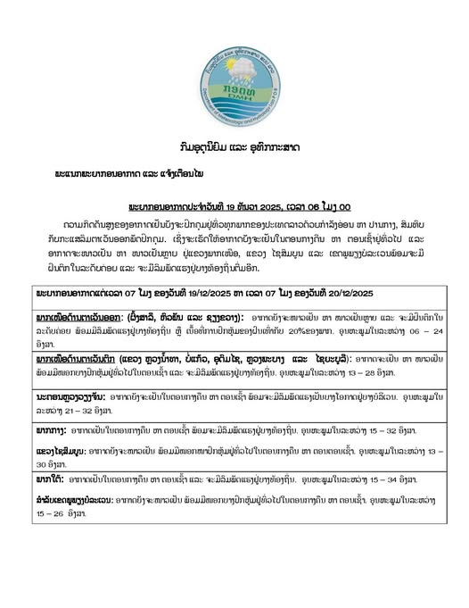 ຄວາມກົດດັນສູງຂອງອາກາດເຢັນຍັງຈະປົກຄຸມຢູ່ທົ່ວທຸກພາກຂອງປະເທດລາວ ດ້ວຍກໍາລັງອ່ອນ ຫາ ປານກາງ, ສົມທົບກັບກະແສລົມຕາເວັນອອກພັດປົກຄຸມ. ເຊິ່ງຈະເຮັດໃຫ້ອາກາດຍັງຈະເຢັນໃນຕອນກາງຄືນ ຫາ ຕອນເຊົ້າຢູ່ທົ່ວໄປ ແລະ ອາກາດຈະໜາວເຢັນ ຫາ ໜາວເຢັນຫລາຍ ຢູ່ແຂວງພາກເໜືອ, ແຂວງໄຊສົມບູນ ແລະ ເຂດພູພຽງບໍລະເວນ ພ້ອມຈະມີຝົນຕົກ ໃນລະດັບຄ່ອຍ ແລະ ຈະມີລົມພັດແຮງຢູ່ບາງທ້ອງຖິ່ນຕື່ມອີກ.