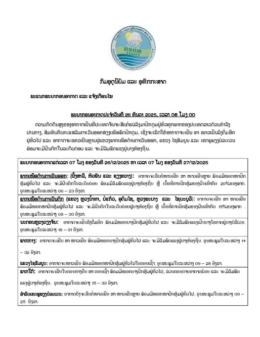 ພະຍາກອນອາກາດ ປະຈໍາວັນທີ 26 ທັນວາ 2025