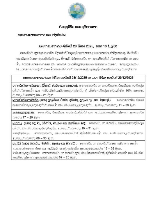 ຄວາມກົດດັນສູງຂອງອາກາດເຢັນ ຍັງຈະສືບຕໍ່ປົກຄຸມຢູູ່ທົົ່ວທຸກພາກຂອງປະເທດລາວ ດ້ວຍກໍາລັງປານກາງ, ສົມທົບກັບກະແສລົມຕາເວັນອອກສ່ຽງເໜືອພັດປົກຄຸມ, ຊຶ່ງຈະເຮັດໃຫ້ອາກາດເຢັນ ຫາ ໜາວເຢັນຢູູ່ທົົ່ວໄປໃນຕອນກາງຄືນ ຫາ ຕອນເຊົົ້າ, ສ່ວນຕອນບ່າຍອາກາດຮ້ອນ ແລະ ອາກາດຈະໜາວເຢັນຫລາຍຢູູ່ເຂດພາກເໜືອດ້ານຕາເວັນອອກ, ເຂດພູພຽງບໍລະເວນ ພ້ອມມີໝອກໜາປົກຫຸ້ມໃນຕອນເຊົົ້າ ແລະຈະມີຝົນຕົກໃນລະດັບຄ່ອຍຢູູ່ບາງທ້ອງຖິຶ່ນ ພ້ອມມີລົມພັດແຮງເປັນບາງໂອກາດ.