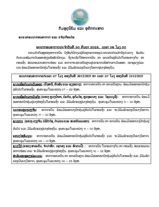 ພະຍາກອນອາກາດ ແຕ່ເວລາ 07 ໂມງ ຂອງວັນທີ 30/12/2025 ຫາ ເວລາ 07 ໂມງ ຂອງວັນທີ 31/12/2025 ພາກເໜືອດ້ານຕາເວັນອອກ (ແຂວງຜົ້ງສາລີ, ຫົວພັນ ແລະ ຊຽງຂວາງ): ອາກາດໜາວເຢັນ ຫາ ໜາວເຢັນຫລາຍ, ພ້ອມມີໝອກໜາປົກຫຸ້ມຢູ່ທົ່ວໄປໃນຕອນເຊົ້າ. ອຸນຫະພູມໃນລະຫວ່າງ 07–22 ອົງສາ.