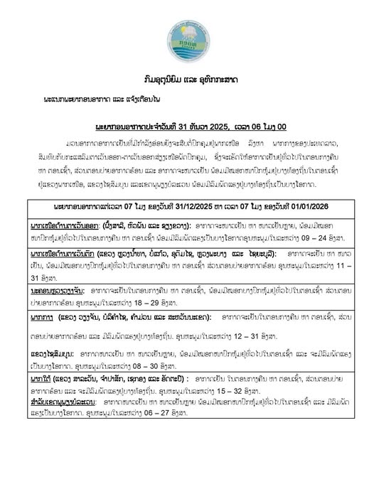 ພະຍາກອນອາກາດ ແຕ່ເວລາ 07 ໂມງ ຂອງວັນທີ 31/12/2025 ຫາ ເວລາ 07 ໂມງ ຂອງວັນທີ 01/01/2026 ພາກເໜືອດ້ານຕາເວັນອອກ (ແຂວງຜົົ້ງສາລີ, ຫົວພັນ ແລະ ຊຽງຂວາງ): ອາກາດຈະໜາວເຢັນ ຫາ ໜາວເຢັນຫລາຍ, ພ້ອມມີໝອກໜາປົກຫຸ້ມຢູ່ທົົ່ວໄປໃນຕອນກາງຄືນ ຫາ ຕອນເຊົົ້າ ພ້ອມມີລົມພັດແຮງເປັນບາງໂອກາດ ອຸນຫະພູມໃນລະຫວ່າງ 09–24 ອົງສາ.