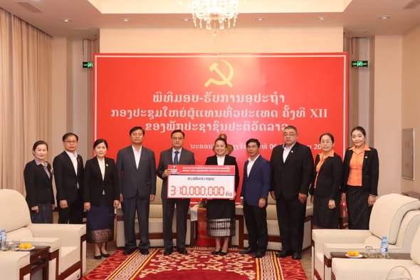 ໃນວັນທີ 5 ມັງກອນ 2026 ນີ້, ພາກລັດ ແລະ ເອກະຊົນ ໄດ້ນຳເອົາເງິນ, ເຄື່ອງບໍລິໂພກ, ເຄື່ອງລະນຶກ ມາມອບໃຫ້ແກ່ລັດຖະບານລາວ ເພື່ອຊຸກຍູ້ກອງປະຊຸມໃຫຍ່ຜູ້ແທນທົ່ວປະເທດ ຄັ້ງທີ XII ຂອງພັກປະຊາຊົນປະຕິວັດລາວ ທີ່ຈະຈັດຂຶ້ນ ໃນລະຫວ່າງວັນທີ 6-8 ມັງກອນ 2026 ຢູ່ນະຄອນຫລວງວຽງຈັນ, ຕາງໜ້າຮັບໂດຍ ທ່ານ ສັນຕິພາບ ພົມວິຫານ ລັດຖະມົນຕີກະຊວງການເງິນ ໂດຍມີພາກສ່ວນກ່ຽວຂ້ອງເຂົ້າຮ່ວມ.