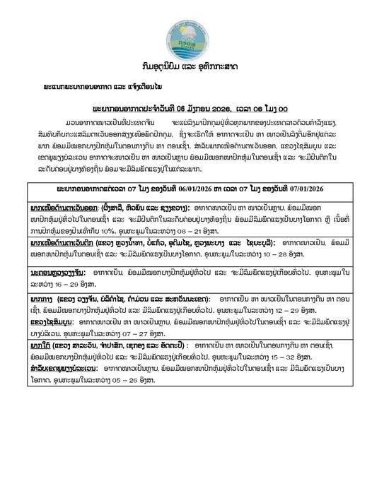 ພະຍາກອນອາກາດ ແຕ່ເວລາ 07 ໂມງ ຂອງວັນທີ 06/01/2026 ຫາ ເວລາ 07 ໂມງ ຂອງວັນທີ 07/01/2026 ພາກເໜືອດ້າ ນຕາເວັນອອກ (ແຂວງຜົ້ງສາລີ, ຫົວພັນ ແລະ ຊຽງຂວາງ): ອາກາດໜາວເຢັນ ຫາ ໜາວເຢັນຫລາຍ, ພ້ອມມີໝອກໜາປົກຫຸ້ມຢູ່ທົ່ວໄປໃນຕອນເຊົ້າ ແລະ ຈະມີຝົນຕົກໃນລະດັບຄ່ອຍຢູບາງທ້ອງຖິ່ນ ພ້ອມມີລົມພັດແຮງເປັນບາງໂອກາດ ຫລື ເນື້ອທີ່ການປົກຫຸ້ມຂອງຝົນເທົ່າກັບ 10% ອຸນຫະພູມໃນລະຫວ່າງ 08–21 ອົງສາ.