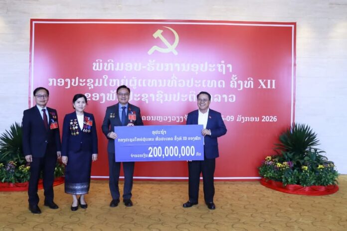 ຕາງໜ້າບໍລິສັດໄຊເສດຖາມອບເງິນຊຸກຍູ້ກອງປະຊຸມໃຫຍ່ຜູ້ແທນທົ່ວປະເທດຄັ້ງທີ XII ຂອງພັກຈໍານວນ 200 ລ້ານກີບ ໃນວັນທີ 7 ມັງກອນນີ້ ທີ່ຫໍປະຊຸມແຫ່ງຊາດ, ໃຫ້ກຽດຮັບໂດຍສະຫາຍ ສັນຕິພາບ ພົມວິຫານ ກໍາມະການສູນກາງພັກ ລັດຖະມົນຕີກະຊວງການເງິນ ຮອງຫົວໜ້າອະນຸກໍາມະການງົບປະມານ ແລະ ການບໍລິຫານ ພ້ອມດ້ວຍຄະນະ.